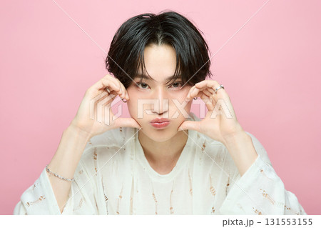 ピンク背景でアジアのキュートな若い男性のポートレート