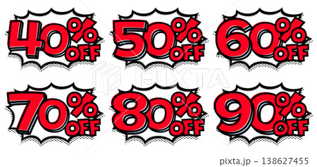 40%から90%OFFの特大セールセット。ギザギザ吹き出しと赤文字の目立つ爆発ロゴアイコン。