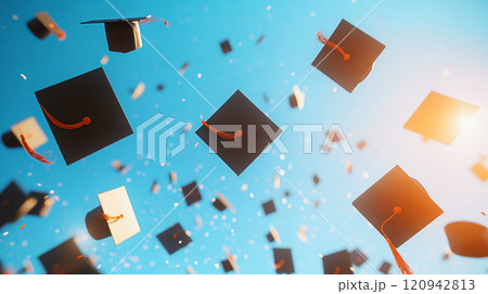 Graduation hats soaring into a clear blue sky. graduation caps in the air. AI Generated.