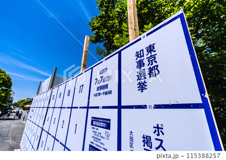 日本の東京都市景観 多摩川駅(東口)前の東京都知事選挙。選挙ポスター掲示場・2024年7月7日投票日