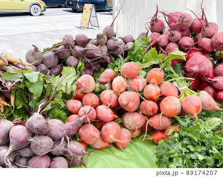 ファーマーズマーケットに並ぶ色とりどりのオーガニック野菜