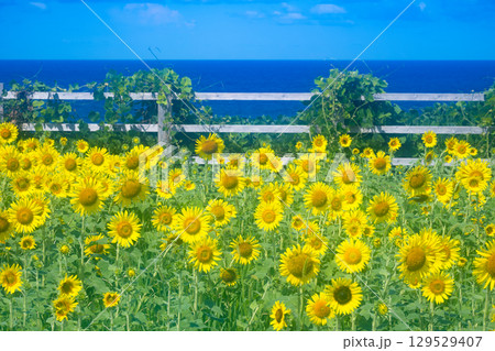 【新潟県_佐渡島】真夏の青い海と青い空とひまわり 7月 8月