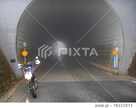 高野山に向かう国道途中、霧に霞むトンネル。バイクは鈴木ジェベル200