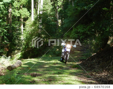 生石山の林道途中、緑の綺麗さに見惚れる。バイクは鈴木ジェベル200