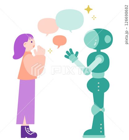 AIロボットに相談する女性の横顔イラスト 未来的コミュニケーション