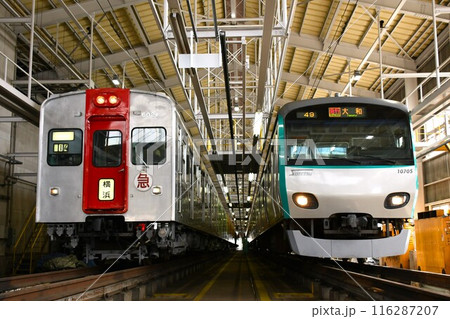 車両基地で並ぶ相模鉄道6000系(急行・横浜表示)と10000系(急行・大和表示)