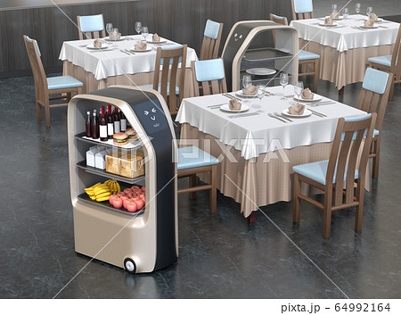 レストランホールに配膳している搬送ロボット。省力化無人搬送サービスのコンセプト