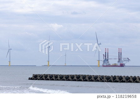 洋上風力発電、着床式建設中(秋田県 潟上市)