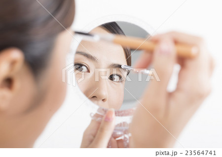 美容 アイブロウブラシ 眉毛 20代後半から30代 メイクアップ 鏡を持つ 見る 白バック