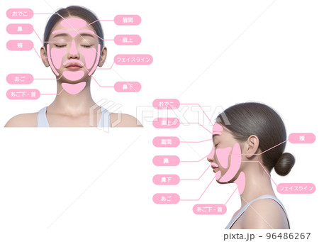 女性が気になる改善したい顔脱毛の施術部位 ナチュラルな日本人3Dモデル女性の正面と横顔のイラスト