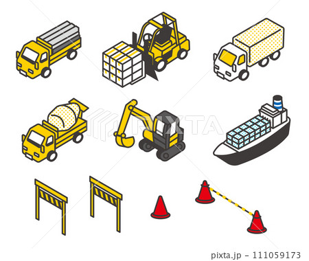 重機や貨物船などの働く車のアイソメのベクターイラスト素材