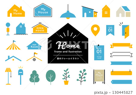 家のフレームとイラストのセット 住宅 住まい 暮らし ライフスタイル リボン 飾り 装飾
