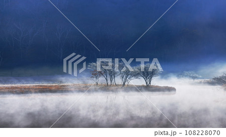 霧に包まれる秋の覚満淵