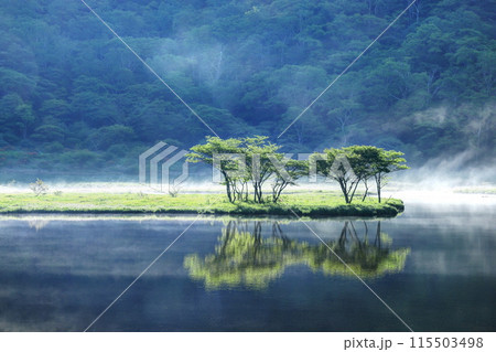 霧に包まれる新緑の覚満淵