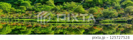 レンゲツツジ咲く新緑の覚満淵(パノラマ)
