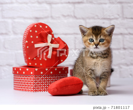 cute kitten Scottish golden chinchilla straight breed on a white background and boxes with gifts