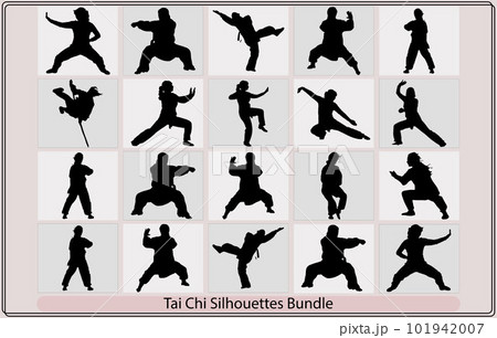 silhouettes of people practicing Tai Chi,Martial Art Kung Fu Tai Chi Self Defense Exercise Fight Master People Man,Tai Chi Chuan man silhouette vector