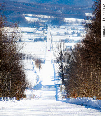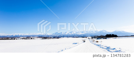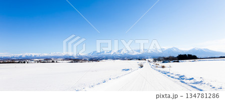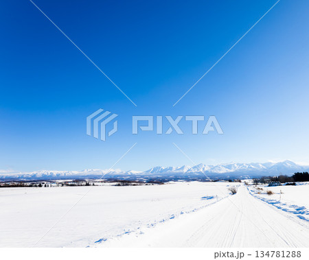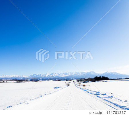 冬の北海道美瑛町周辺から見た十勝岳連峰と冬道のイメージ風景