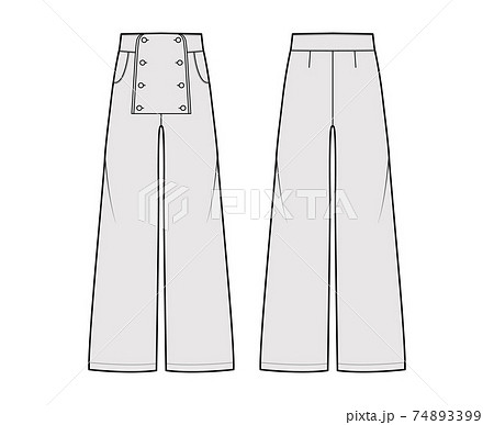 Set of Pants sailor technical fashion illustration with low waist, rise, full length, pockets, front buttons. trousers