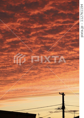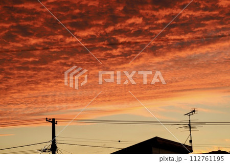 9月中旬、家々の先に見える、鱗雲の真っ赤夕焼けです。