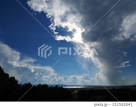 夏の午後、渦巻き状の巨大な積乱雲が太陽を覆いう。漏れる光が猪苗代湖の湖面を輝かせ、ダイナミックだ。