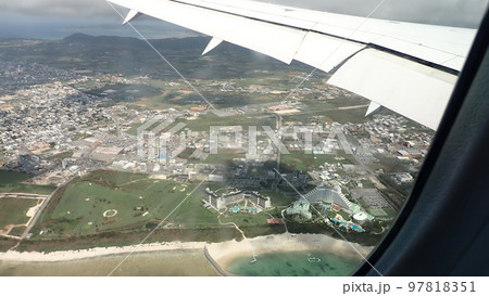 石垣空港着陸前に石垣市街を空撮(沖縄県石垣市)