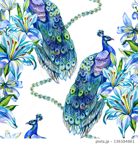 Hand-painted watercolor seamless pattern featuring majestic peacocks perched among elegant blue lilies and delicate pearl beads. This luxurious botanical composition captures exotic birds and blossoms