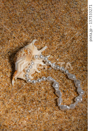 Gleaming Jewelry Display. Close View Of Glossy Pearl Chain Lying On Textured Sandy Conch Shell Surface
