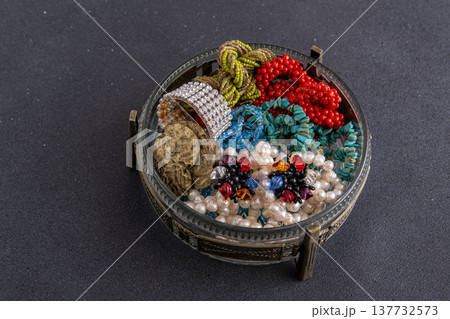 Assortment of vintage colorful Beaded Jewelry and Earrings. Bohemian Jewelry on dark background