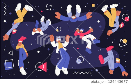 People wearing augmented reality glasses. Gamblers, shopaholics and scientists use new technologies, virtual reality, tourism and space exploration, garish vector cartoon isolated set