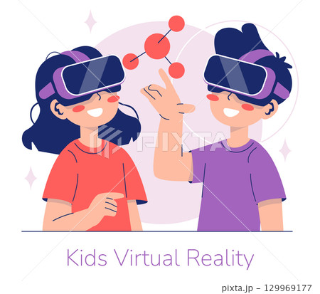 Vector illustration of two kids using virtual reality headsets, interacting with a digital 3D model. They are smiling and engaged in a fun, interactive learning experience.