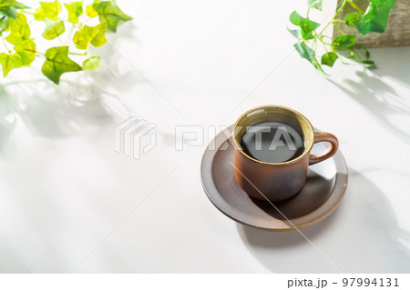 コーヒー - 淹れたてのコーヒーが入ったマグカップを、真上から俯瞰したイメージ