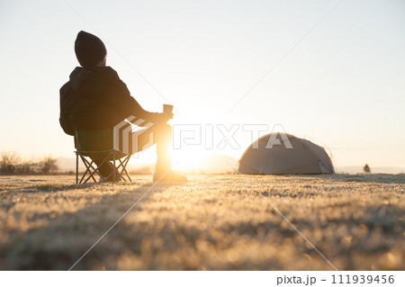 キャンプ場でコーヒーを飲みながら朝日を眺める男性