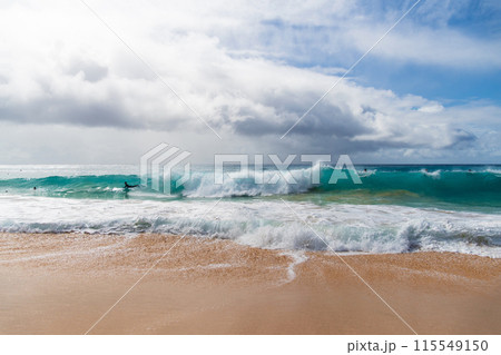A person is standing on a sandy beach, gazing at the waves of the ocean