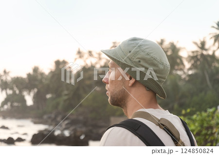 Man in hat and backpack gazing at tranquil tropical coastline during sunrise, looking away. Palm trees and rocks in background. Travel summer vacation. Adventure and reflection.