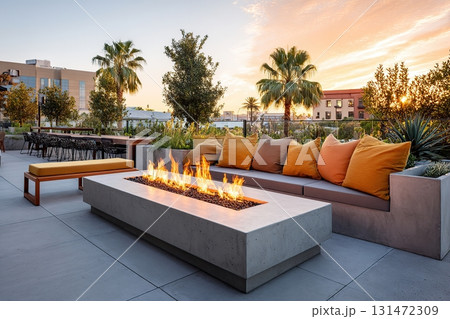 Elegant firepit area with smart seating under a vibrant sunset sky in an urban setting