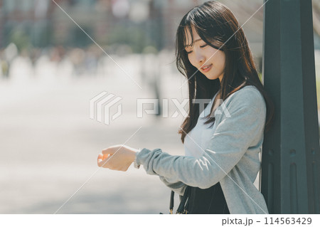 待ち合わせ場所に先に着いて腕時計で時間を確認する若い女性
