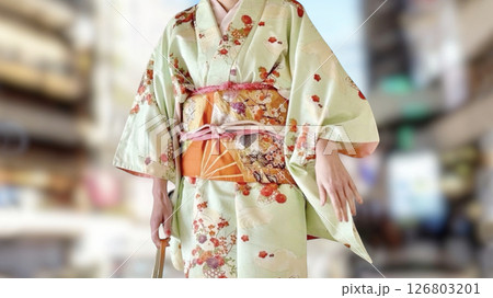都会の中を着物を着て歩く女性_背景ボカシ_ワイド