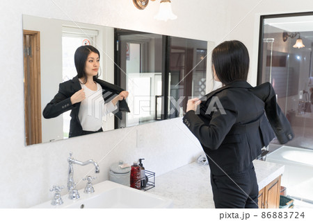 鏡の前でスーツを着て身支度するビジネスウーマン