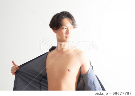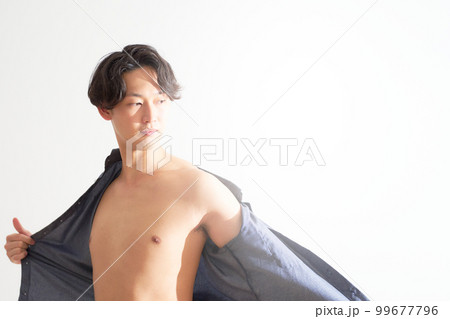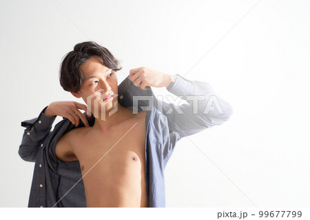 シャツを脱いで素肌を見せる若い男性 メンズビューティー ライフスタイル イメージ