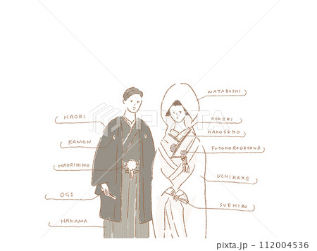 白無垢(綿帽子)と紋付袴姿の新郎新婦、結婚式、線画