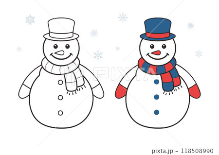 Cute funny snowman line art coloring page for kids. Illustration for children. Coloring book