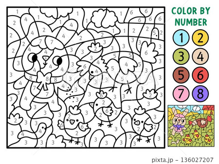 Vector Easter color by number activity with Bunny feeding birds on the farm. Spring black and white counting, colouring game. Cute coloring page for kids. Line printable worksheet