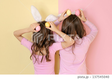 Two girls in pink outfits with bunny ears holding colorful Easter eggs on pastel background. Spring holiday concept, childhood, fun and festive mood, back view.
