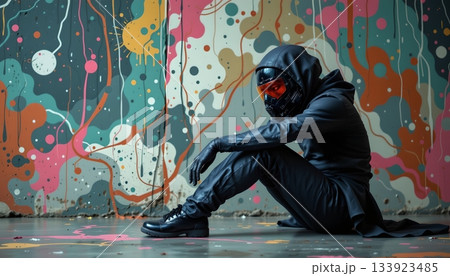 A person crouched against a vibrant, abstract graffiti background