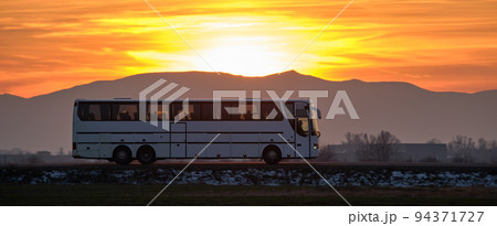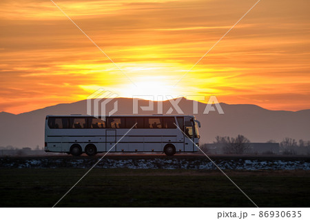 Intercity passenger bus driving on highway road in evening