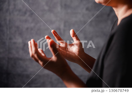 Christian woman lifts her hand in worship to pray, hope, faith, and deep belief in God defines core concept of religion. Praying hands with faith in religion, belief in God. Power of hope or love.