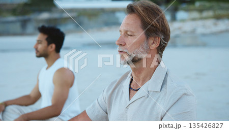 Men, breathing and meditation for wellness, beach and routine for inner peace, stress relief and zen. Outdoor, fresh air and people with spiritual awareness in nature, inhale or calm with mindfulness