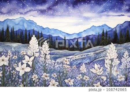 星明りの下で輝くスピリチュアルな夜のお花畑と山並み AI画像