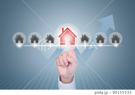 商務人士手指點擊虛擬屏幕上的房子圖標,人物置業概念創意圖